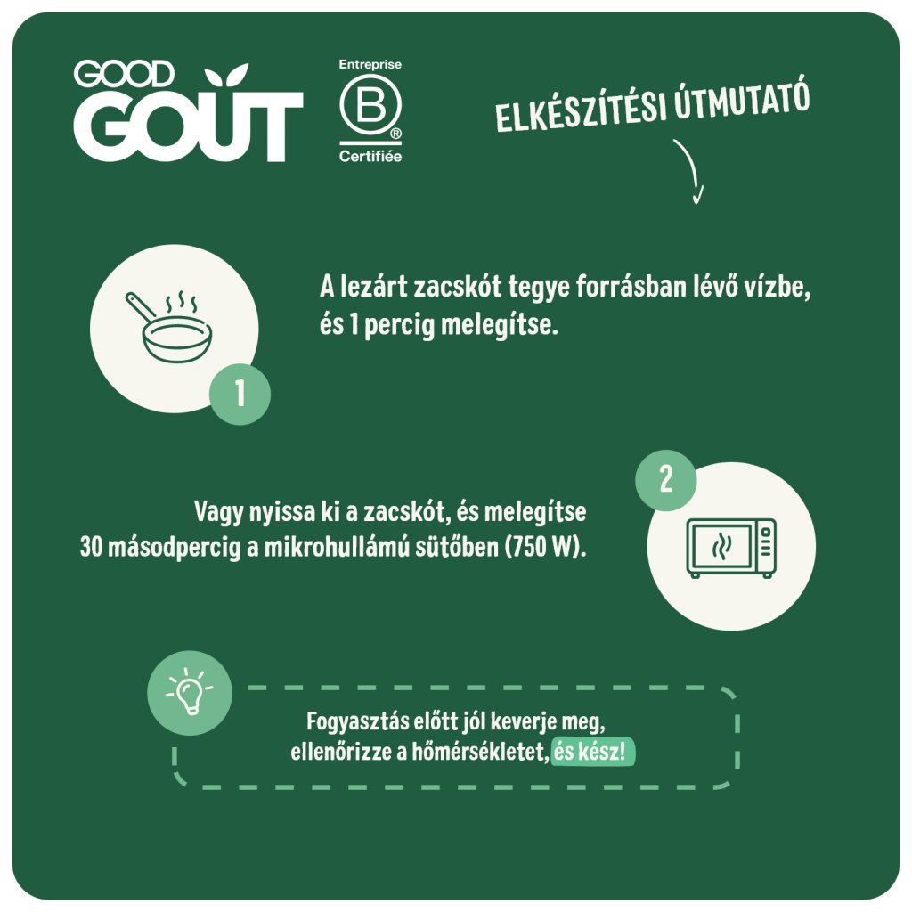 Tegye a zárt zacskót forrásban lévő vízbe, és melegítse 1 percig, vagy nyissa ki a zacskót, és melegítse 30 másodpercig mikrohullámú sütőben (750 W). Fogyasztás előtt jól keverje meg, ellenőrizze a hőmérsékletet és kész!