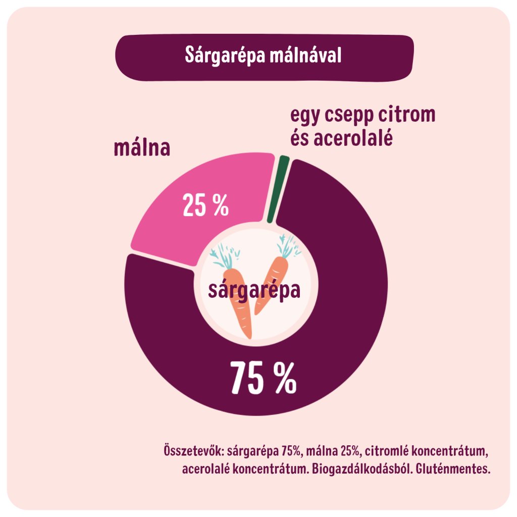 Összetevők: *sárgarépa 75%, *málna 25%, *citromlé koncentrátum, *acerola gyümölcslé koncentrátum. *a biogazdálkodásból. Gluténmentes.