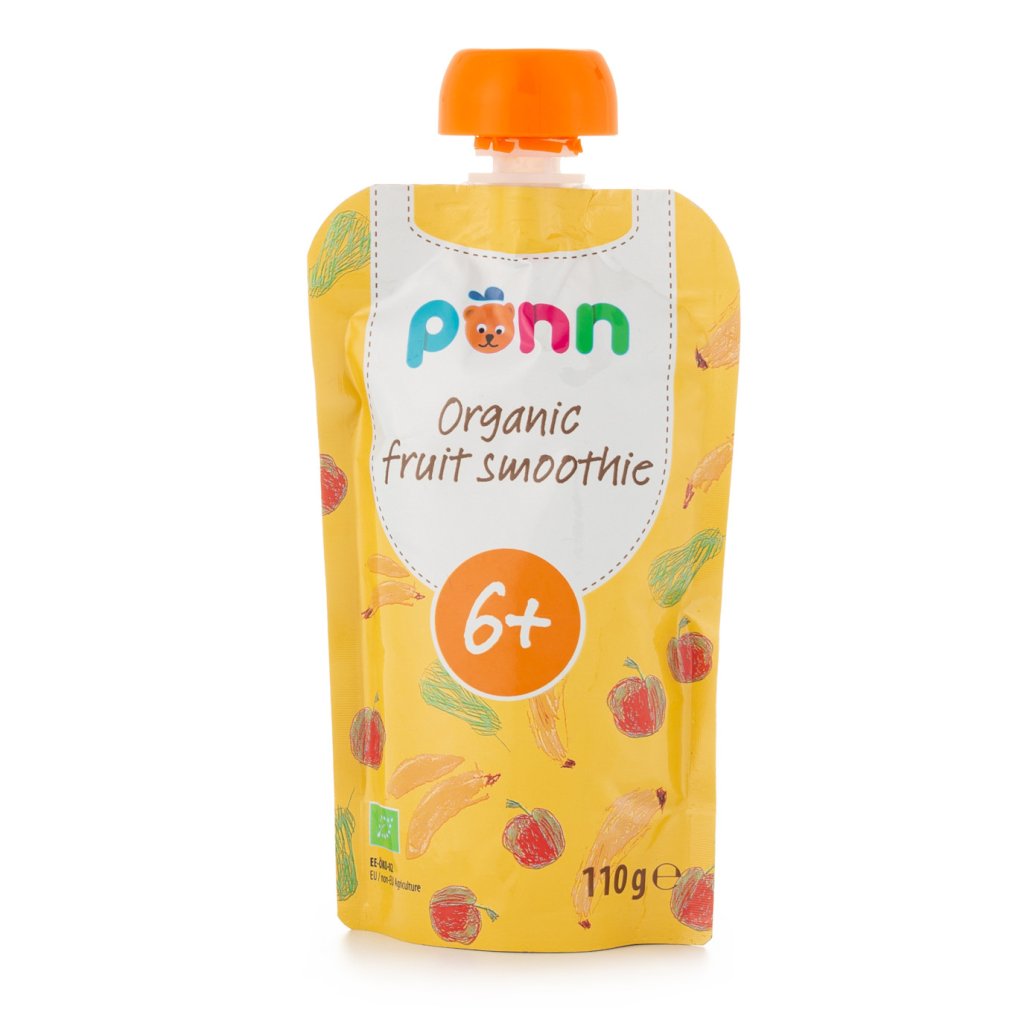 Összetevők: bio banánpüré (35 %), bio körtepüré (31 %), bio almapüré (20 %), víz, sűrített bio ananászlé (3 %). Gluténmentes.