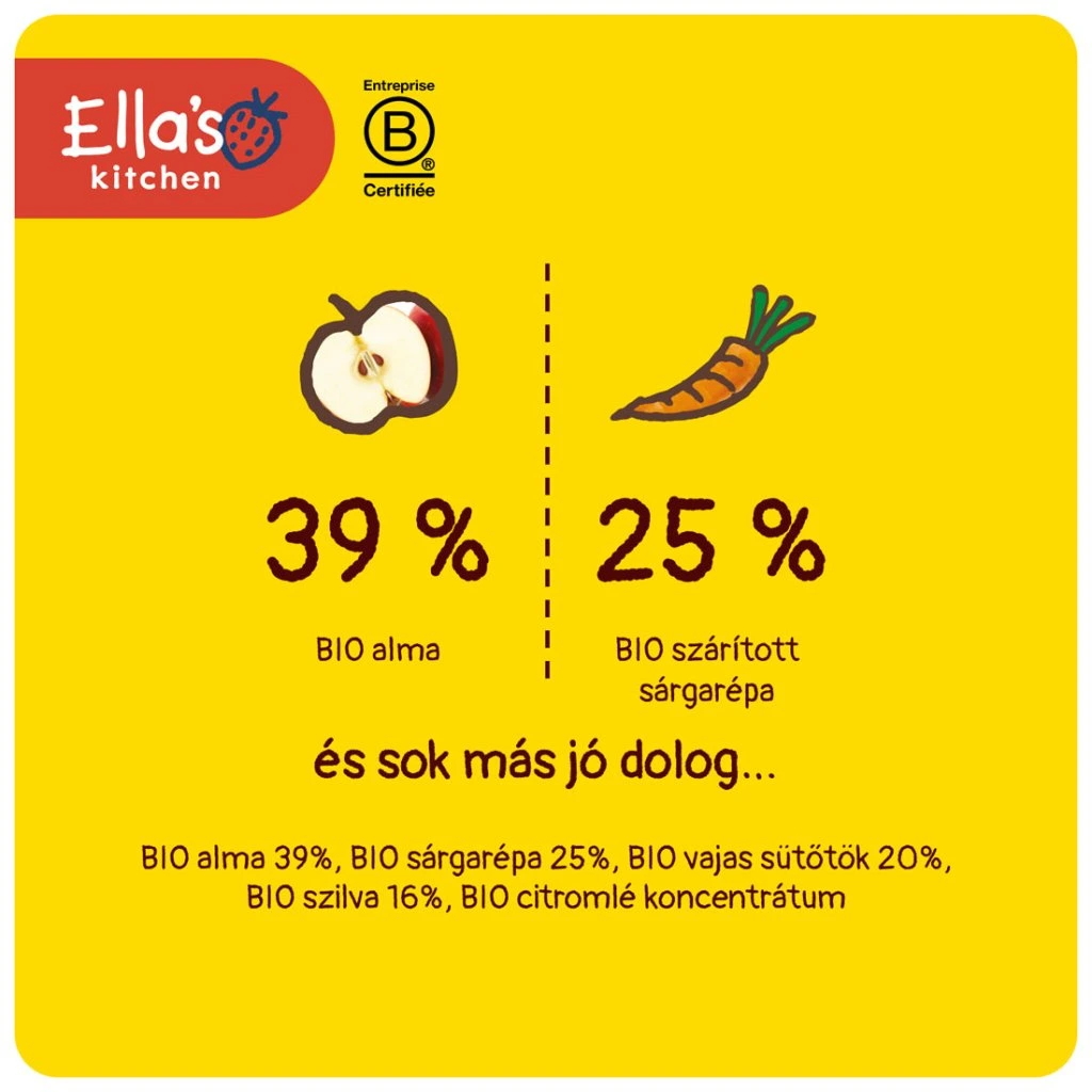 BIO alma 39%, BIO sárgarépa 25%, BIO vajas sütőtök 20%, BIO szilva 16%, BIO citromlé koncentrátum