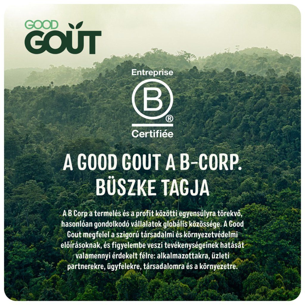A B-Corp hasonló gondolkodású vállalatok globális közössége, amely egyensúlyt keres a termelés és a profit között. A Good Gout megfelel a szigorú társadalmi-környezeti normáknak, és figyelembe veszi cselekvéseinek hatását minden érdekelt félre: alkalmazottakra, üzleti partnerekre, ügyfelekre, társadalomra és környezetre.