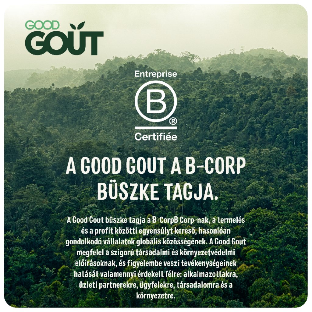 A B-Corp hasonló gondolkodású vállalatok globális közössége, amely egyensúlyt keres a termelés és a profit között. A Good Gout megfelel a szigorú társadalmi-környezeti normáknak, és figyelembe veszi cselekvéseinek hatását minden érdekelt félre: alkalmazottakra, üzleti partnerekre, ügyfelekre, társadalomra és környezetre.