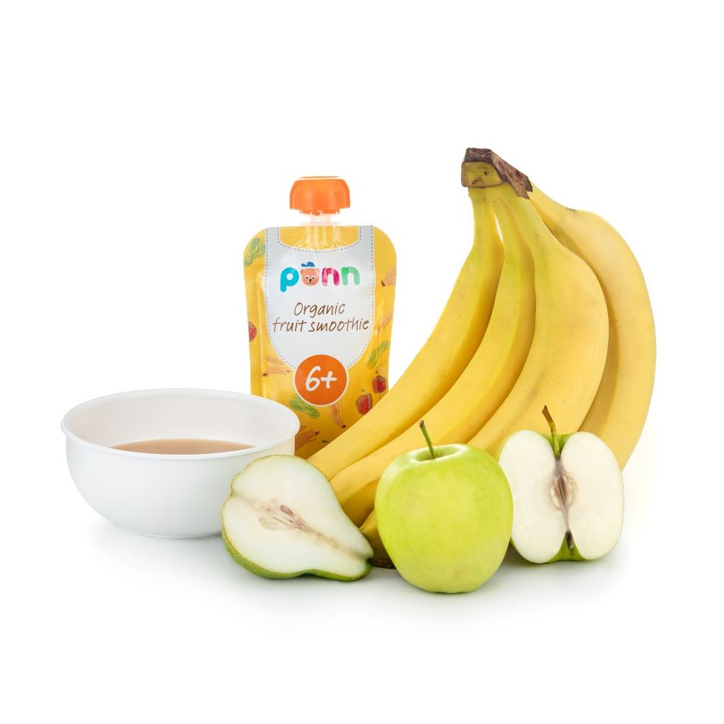 Összetevők: bio banánpüré (35 %), bio körtepüré (31 %), bio almapüré (20 %), víz, sűrített bio ananászlé (3 %). Gluténmentes.