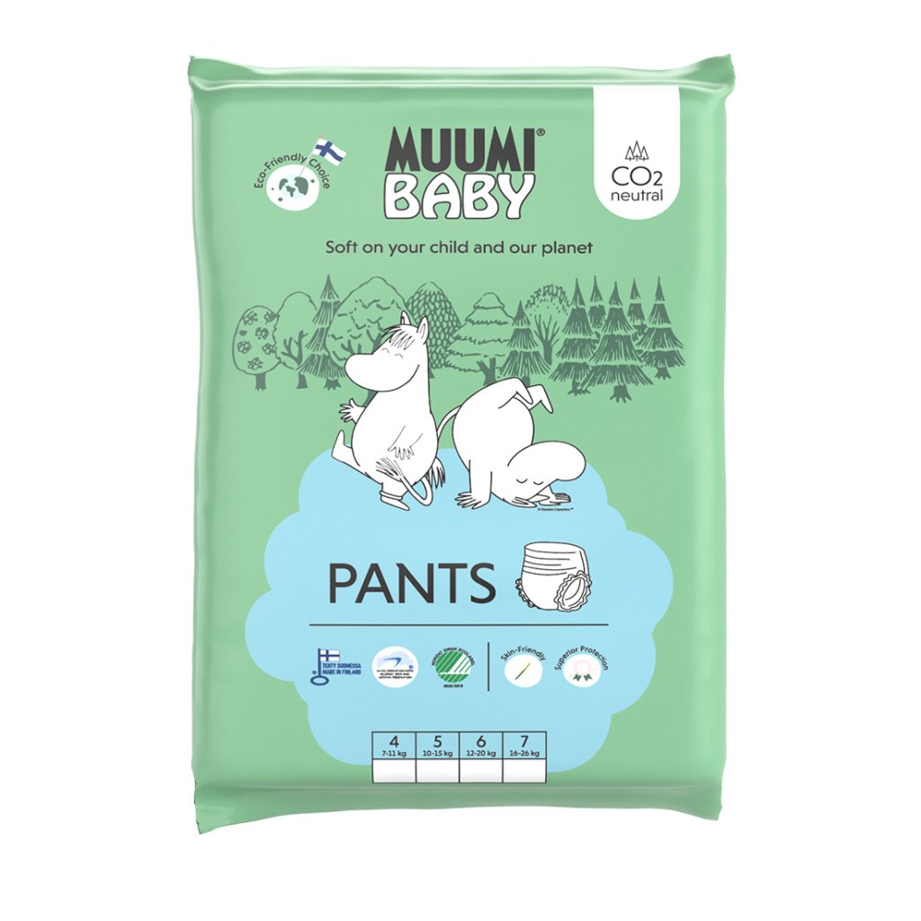 A pelenkák környezeti terhelésének kiszámításakor a pelenka teljes életciklusát figyelembe kell venni, a nyersanyagtól a gyártáson át az ártalmatlanításig. A Muumi Baby pelenkák helyi termelőktől származó, gondosan kiválasztott nyersanyagokból készülnek. A Muumi Baby pelenkákban található finn cellulóz teljesen klórmentes, és 100%-ban tiszta oxigénnel fehérítik. Ez a legbiztonságosabb megoldás a környezet és a babák bőre számára. A Muumi Baby pelenkák klórmentesek, így normál hulladékként ártalmatlaníthatók. A csomagolás 25%-ban újrahasznosított műanyagból készül, és újrahasznosítható.