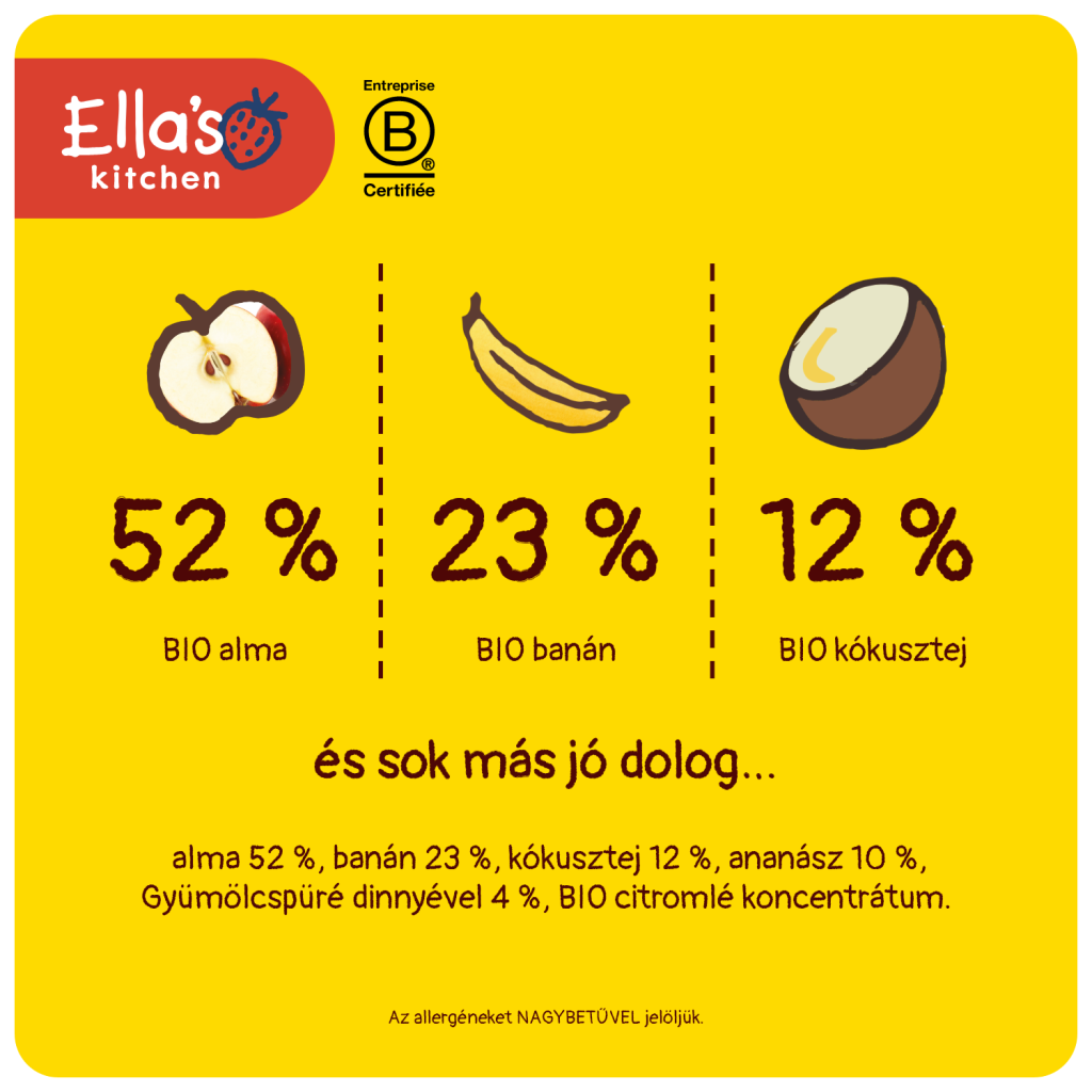 Összetevők: bio alma 52%, bio banán 23%, bio kókusz 12%, bio ananász 10%, bio dinnyelé 4%, bio citromlé-koncentrátum.